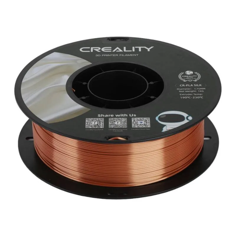 Creality's CR-Silk filament has a metallic sheen, perfect for printing figurines, decorations, and jewelry. It is durable, compatible with most Creality printers, and made from environmentally friendly materials.