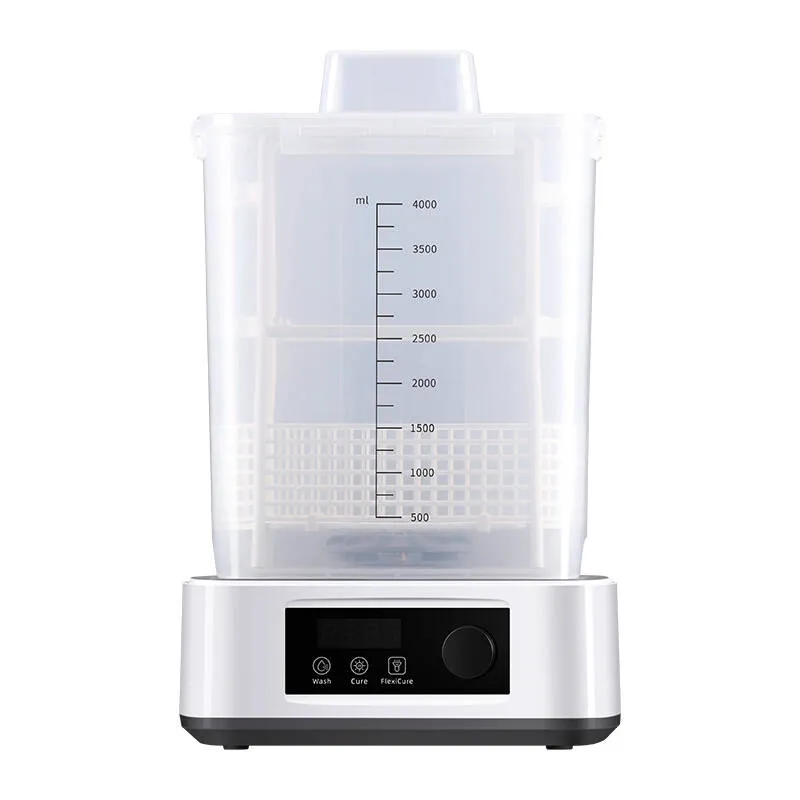 The device's basket has a 3L capacity, and the cleaning module can hold up to 4L. It can clean prints up to 165 x 100 x 180 mm (in the basket) or 165 x 100 x 165 mm (with the platform). The curing space dimensions are 160 x 180 mm.