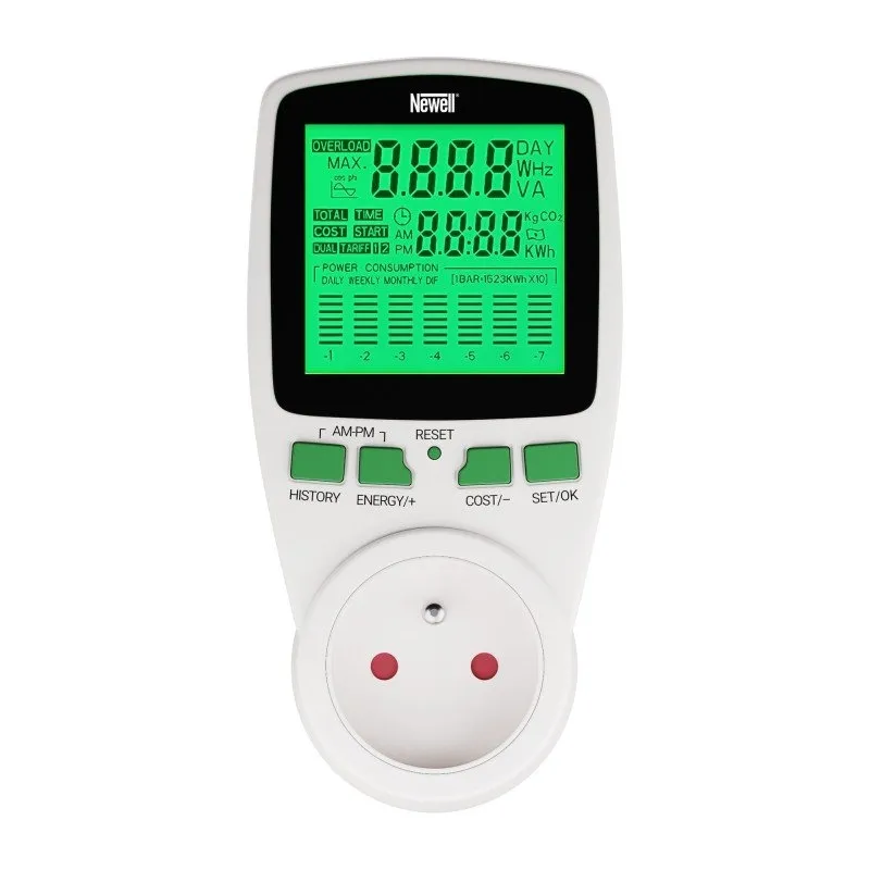Although the Newell wattmeter is powered directly from the socket, you will find a small LR44 battery compartment on its housing. This will store all the data on the energy consumed and its cost in memory. A power cut or connecting the meter to another device will not cause the information from previous days, weeks, or months to be lost. As long as you do not decide to reset it yourself, the history of your energy consumption will always be available from the screen.