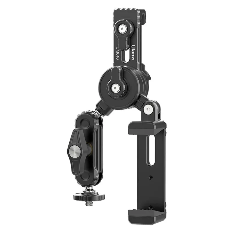The sturdy aluminium mount can hold a camera and a smartphone side by side. The mount supports up to 900 g and features a 1/4-20 screw with a GoPro adapter and a smartphone clamp for devices up to 85 mm wide. The clamp can be attached in any direction, with 360-degree rotation for the camera and side-to-side tilt for the smartphone arm.