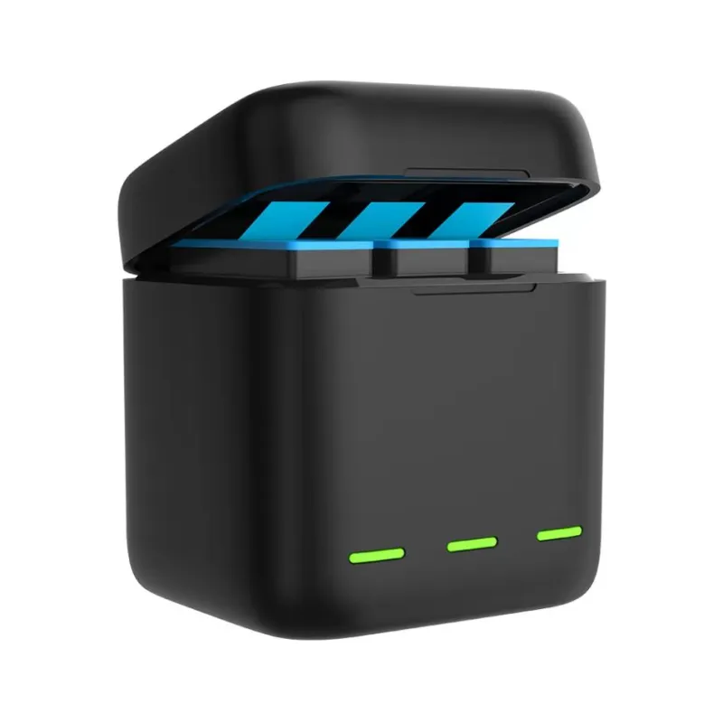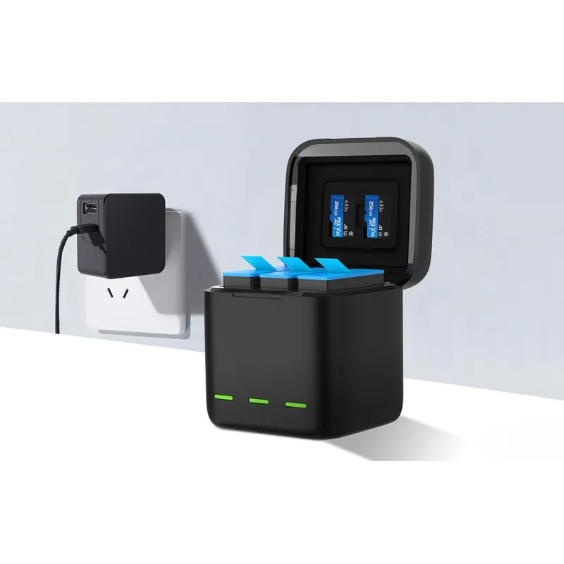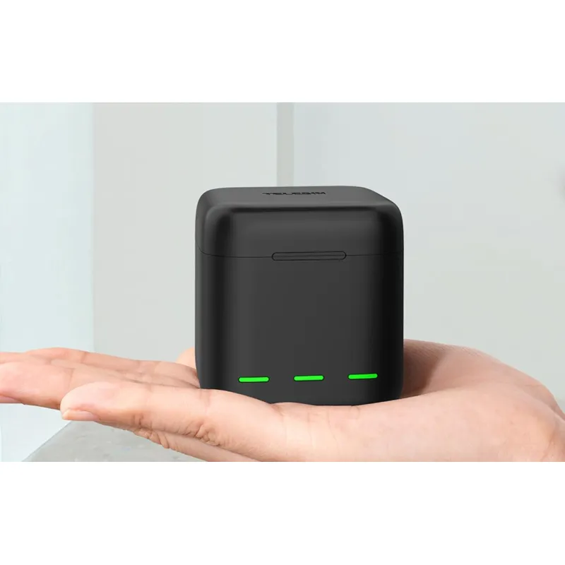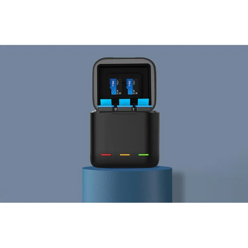 The Telesin 3-in-1 charger allows you to quickly charge up to 3 GoPro Hero batteries simultaneously. Lightweight and compact - you can always have it on hand. Its complex security system makes it's using risk-free. What's more, the built-in LED indicators provide real-time information about the charging status. As an added bonus, the charger has a silicon compartment to store up to 2 TF memory cards.