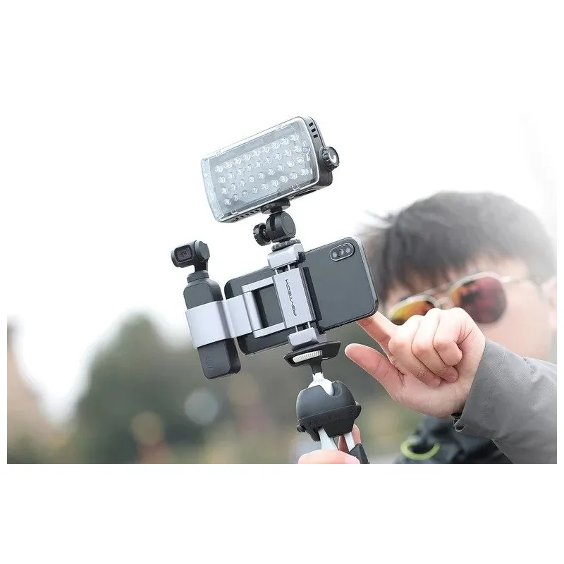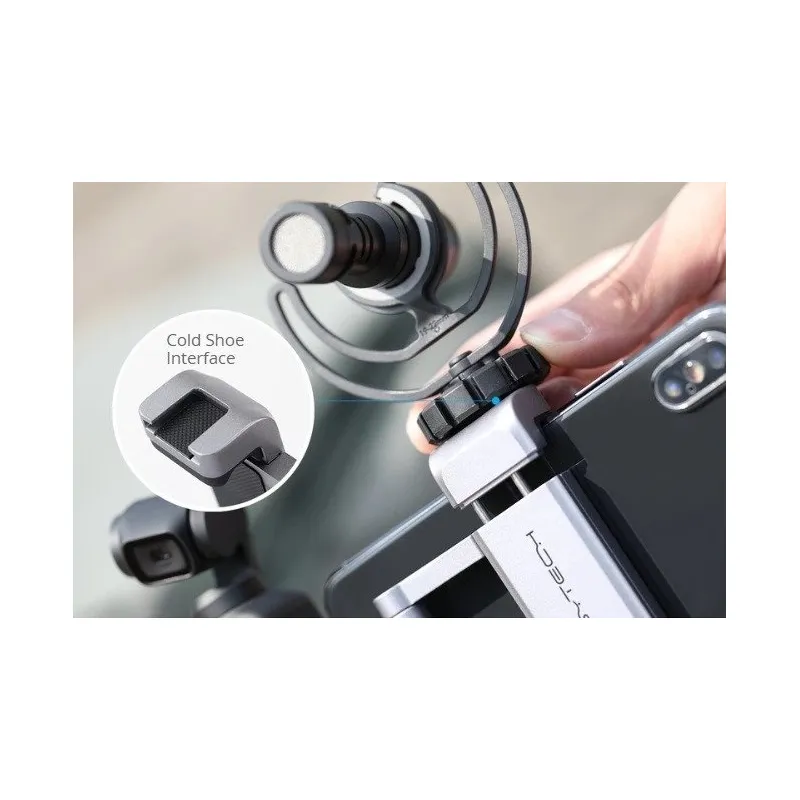 Designed specifically for the DJI Osmo Pocket, the smartphone mount (Plus version) protects the data port from bending or breaking off. In addition, thanks to Cold shoe and 1/4-inch mounts, we can install external devices such as a light, microphone or tripod. A silicone non-slip coating keeps the mounted equipment in place during transport. Unlike the basic version, it is made entirely of high-quality aluminum.