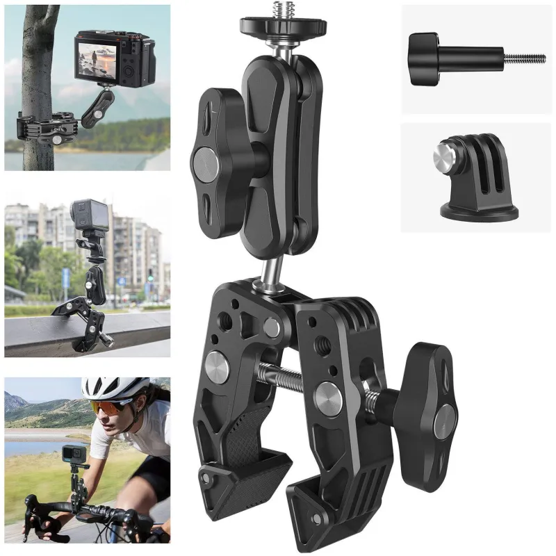Mount your action camera, monitor, smartphone, or camera onto almost any surface up to 2.6" wide with the Multifunction Crab Clamp from TELESIN. This mount consists of a crab-style clamp, a 2.3" adjustable ball head arm with a 1/4"-20 mounting screw, and a 3-prong action camera adapter. The aluminum clamp supports weights up to 4.4 lb. and features non-slip pads and both 1/4"-20 and 3/8"-16 threads. The adjustable arm features ball heads with 1/4"-20 screws, 90° of tilt, and 360° of rotation.