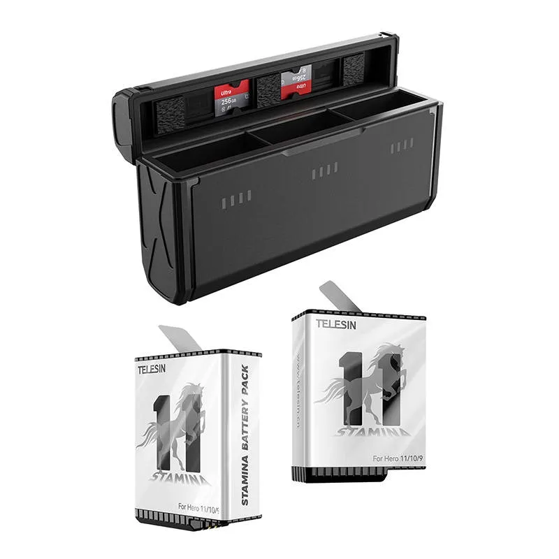 The three-channel charger from Telesin allows you to store and renew the power of up to 3 GoPro Hero 12, Hero 11, Hero 10 and Hero 9 batteries. The USB-C port offers up to 15 watts of power, and LED indicators will let you know the charging status. Now you can charge your batteries on the go and outdoors - without worrying about losing power while recording your most important moments. Whats more, thanks to its clever design, the device is extremely handy and provides space for 2 TF cards. The kit comes with 2 rechargeable batteries.