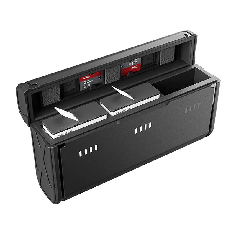 What sets the Telesin charger apart is its unique case-like design. This makes the device extremely practical and its transportation hassle-free - you can conveniently stow it in your bag or even pocket. In addition, the charger offers space for 2 TF memory cards. As a result, the Telesin product is not only functional when charging batteries, but also allows you to conveniently store your accessories. Its the perfect solution for travelers and active filmmakers who value order and mobility.