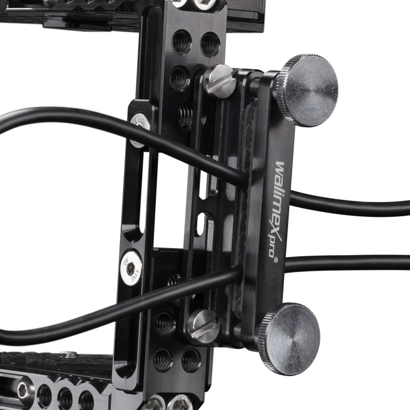 Defective jacks and cable connections are things of days gone by. No matter whether USB, flash synchronization or HDMI connections: The Cable Protection protects these highly sensitive areas against defects caused by pulling the cable. One or several cables at a time can be simply routed through and fixed with two knurled screws. Rubber paddings on either side protects the cables against damage. This padding also allows you to fix cables of different thicknesses. With two 1/4 inch screws the cable protection can be flexibly fastened on the Cage. Just like all accessory parts of the Aptaris system, this cable protection has also been developed and made in Germany. It is characterized by its outstanding workmanship. Extremely light and long lasting aircraft aluminium is also used for this product.
