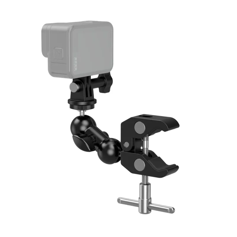 SmallRig Crab-Shaped Super Clamp with Ballhead Magic Arm 4373 includes a ballhead magic arm, a crab-shaped clamp, an action camera mount, and a phone holder. There is a 1/4-20 screw on one side of the magic arm for an action camera, monitor, LED video light, microphone, etc. The ball head features anti-slip threads for a firm lock. An anti-twist structure secures the ballhead magic arm to the crab-shaped clamp firm to ensure they do not become loose or fall off while moving. The clamp opens as wide as 54mm/2.1in and is compatible with DJI Ronin, FREEFLY MOVI Pro, and any 30mm rods, with easy adjustment via a knob. The clamp is embedded with pads which effectively protects the clamping object and enhances the stability of the clamping. The entire kit can be used with the included action camera mount to adapt to GoPro Hero Cage3084C&3083C, Frame for Insta360 X34088B, and Cage for DJI Osmo Action4119. The phone holder supports 56-86mm wide and no more than 9mm thick smartphones.