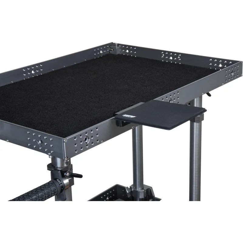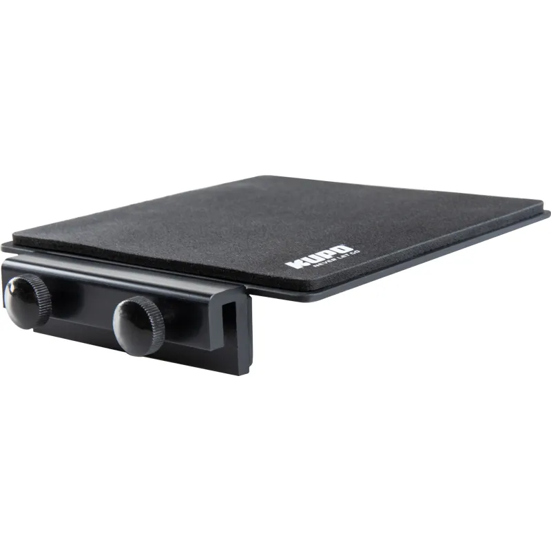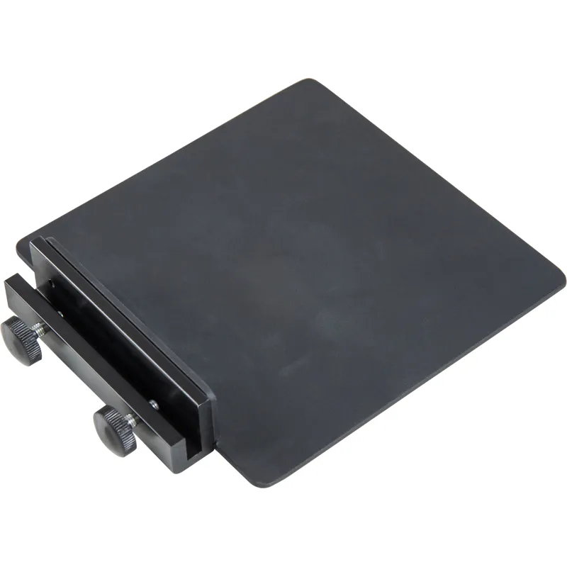This mouse holder with pad is fixed with a rail clamp, allowing you to work comfortably with a mouse on the camera cart. The rail clamp is easy to fit onto the edge of the shelf on the cart, using tightening knobs that accept a maximum thickness of 6mm on the side.