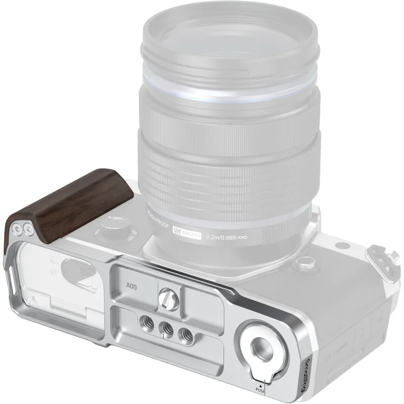 This mounting plate is ideal for photographers and videographers looking to improve their shooting experience with the OM SYSTEM OM-3. The combination of the L-shape and wooden handle provides both functionality and comfort during use.