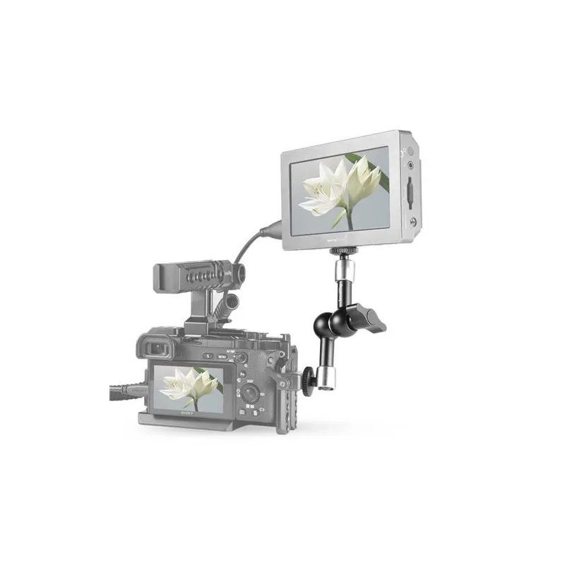 SmallRig 7 inch (18cm) Articulating Arm 2065. It is equipped with 1/4’’ screws on both ends respectively. Thus, it could attach monitor via the 1/4’’ screw on the one end and attach accessories with 1/4’’-20 threaded holes on the other end, like cage, NATO Rail 1973, 15mm Rod 1182 and Quick Release Rod Clamp 1976 etc. Mounted with 1/4’’ screw is a rubber cushion which could prevent the scratches of monitor and help to lock the monitor tighter. It features an ergonomic wingnut for great convenience that could help to adjust any angles based on your needs.