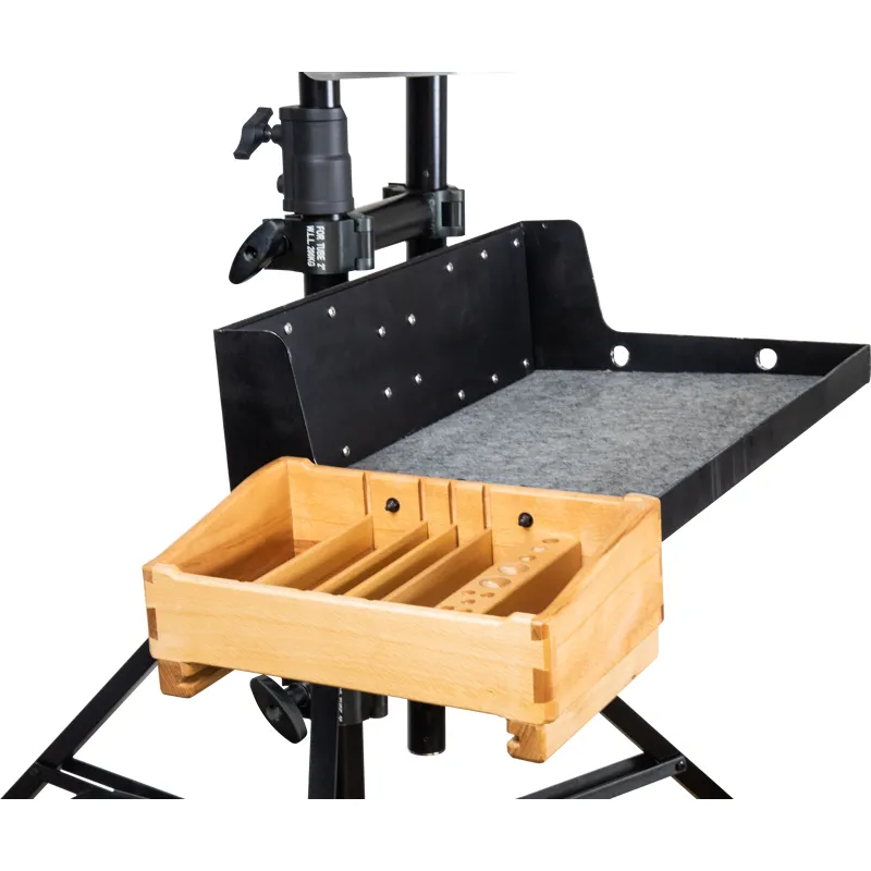 This front box holder is fixed with a rail clamp, providing more space and easy access to those camera front box tools on the camera cart. The rail clamp is easy to fit onto the edge of the shelf on the cart, using tightening knobs that accept a maximum thickness of 6mm on the side.