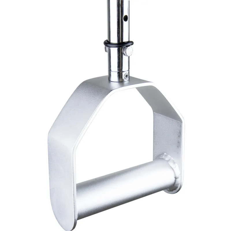 Made of 5mm thick gauge aluminum alloy and welded with a 50mm diameter tube, this stirrup head is designed for mounting lighting fixtures with a clamp or coupler. It features a 12.5mm diameter hole on the bracket for attaching a telescopic hanger or drop pole. Available in black and silver paints.