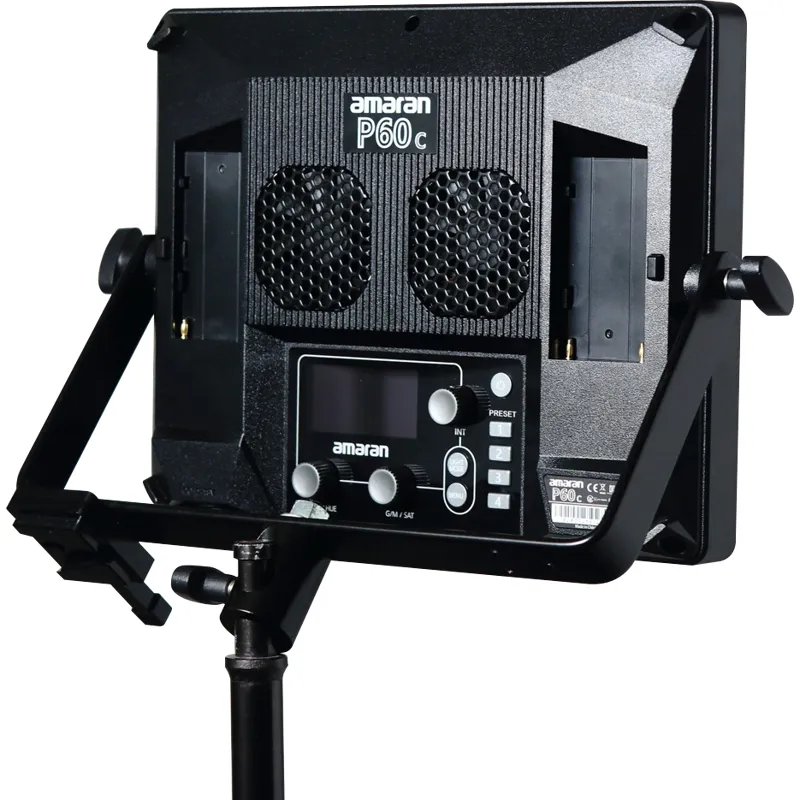 The tailor-made aluminum yoke with black coating is specially designed for the Apture Amaran P60C, allowing you to tilt your LED panel effortlessly. It features a V-lock base mounted on the yoke, offering an ideal mounting solution for V-mount batteries when AC power is not available on location.