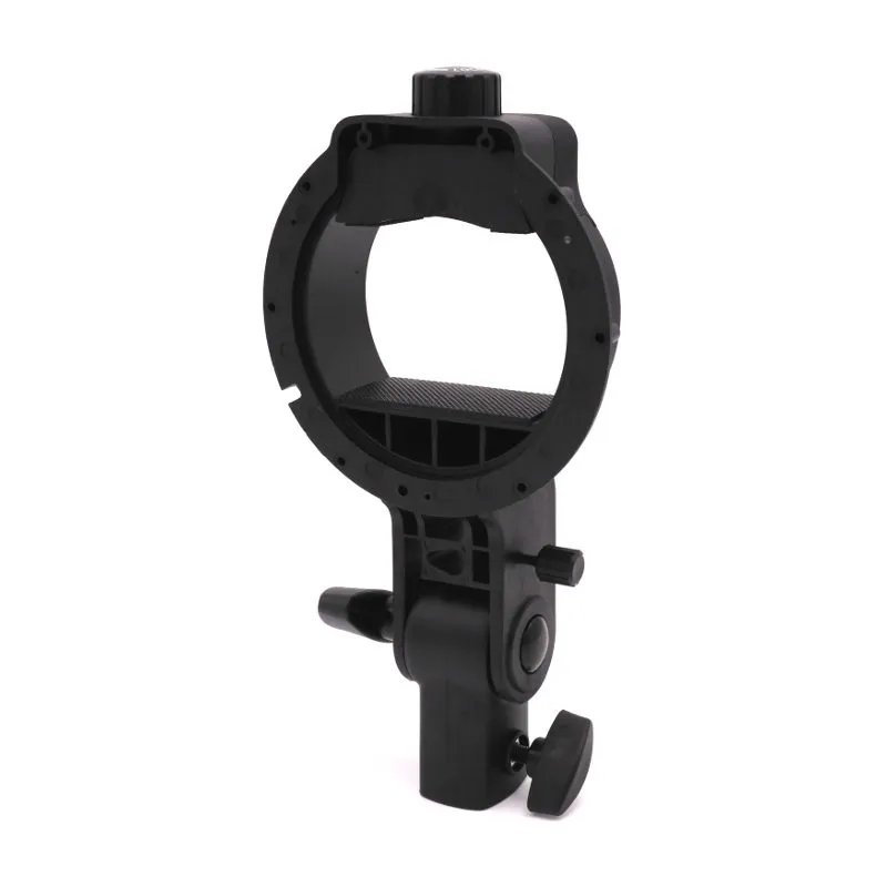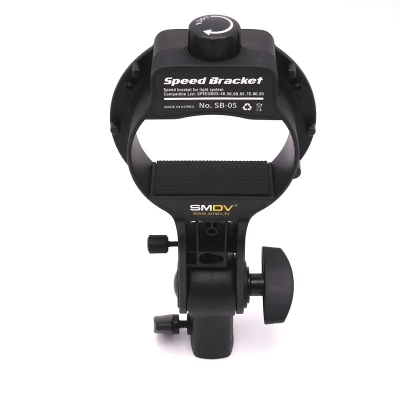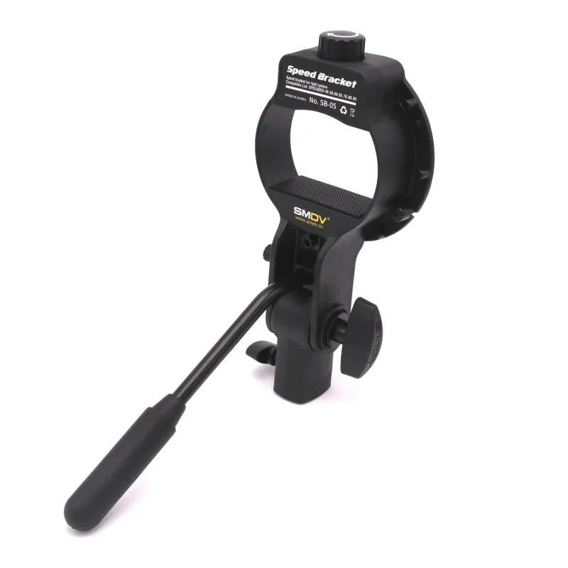 The SMDV SB-05 allows you to use a speedlite on the various softboxes SMDV's S-series. The inside of the SB-05 in which you place the flash unit measures 53 x 70 millimetres at the largest. The flash unit is then secured with a clamp that you tighten with a knob at the top. A handle is included to make it easier to aim the setup. The hole where you atach the handle can also be used to hold an umbrella.