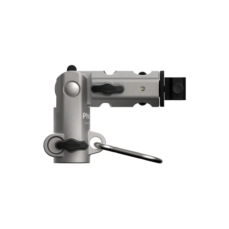 The Varos Pro BG Multi-Function Flash Shoe Umbrella Holder from Phottix is 300% stronger than previous versions and features an aluminum alloy body with a metal cold shoe as well as a 3/8" and 1/4" female threaded insert and a male insert with 3/8" and 1/4" screws. The holder's teardrop-shaped umbrella mount accepts shafts from 7 to 10 mm in diameter and is slanted 8 degrees to allow more light to hit the center of the umbrella. Its patented 180-degree tilting mechanism will support up to 66 lb (30 kg). The Varos Pro BG has a hanging hole with a clip for use with a counterweight or other accessory.