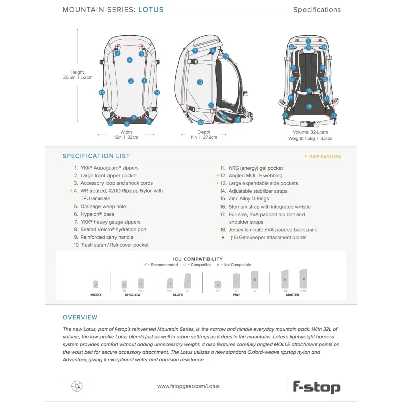 F-Stop Lotus Anthracite (Black) The F-stop Lotus backpack is designed to help the professional videographer in his or her workflow. Because you have access to the main compartment of the Lotus backpack from both the top and the front, you can quickly access your equipment. The multifunctional recess on the back can be used for a Hydration Sleeve or to store a 13 "laptop.