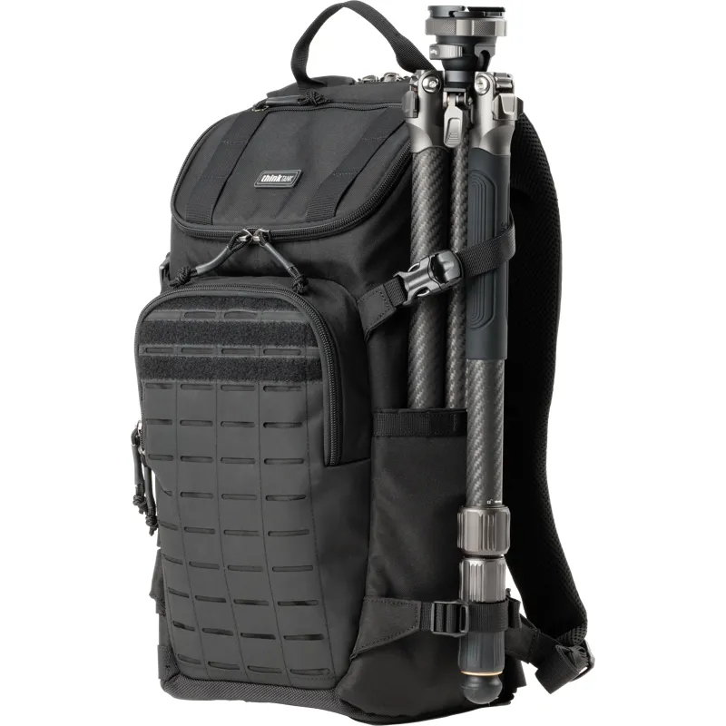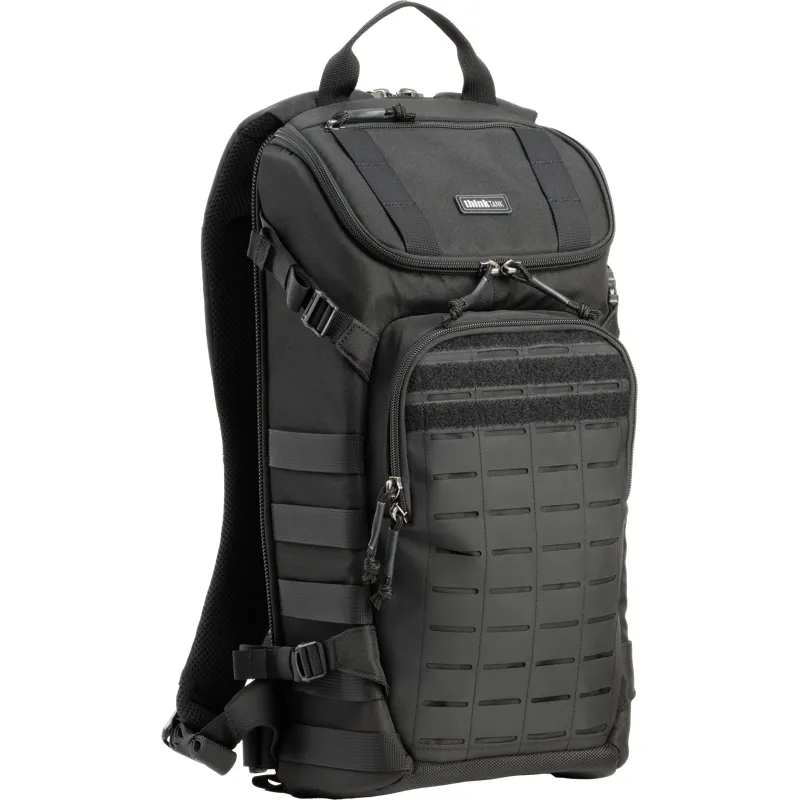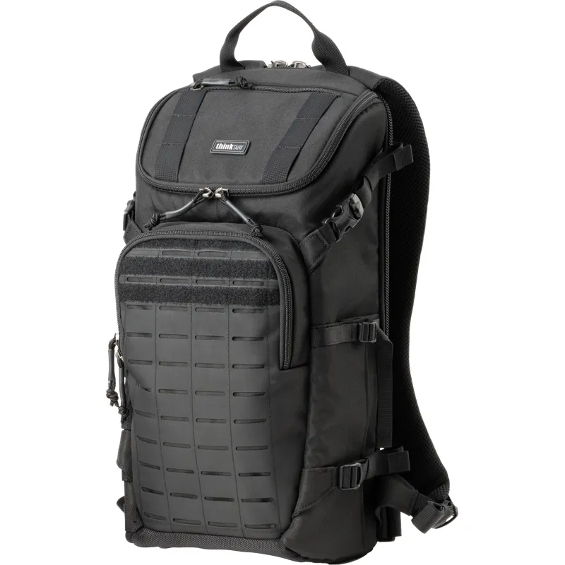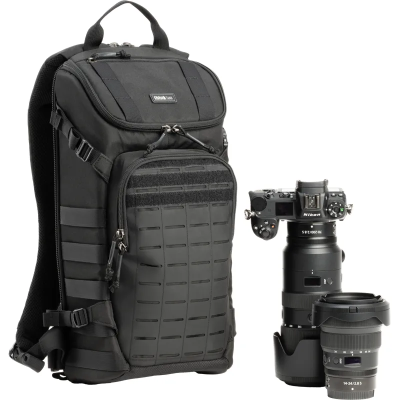 The DarkLight backpack is a modern photo bag designed for urban and outdoor use. It features a laser-cut MOLLE panel and tactical strap rails for precise equipment configuration.