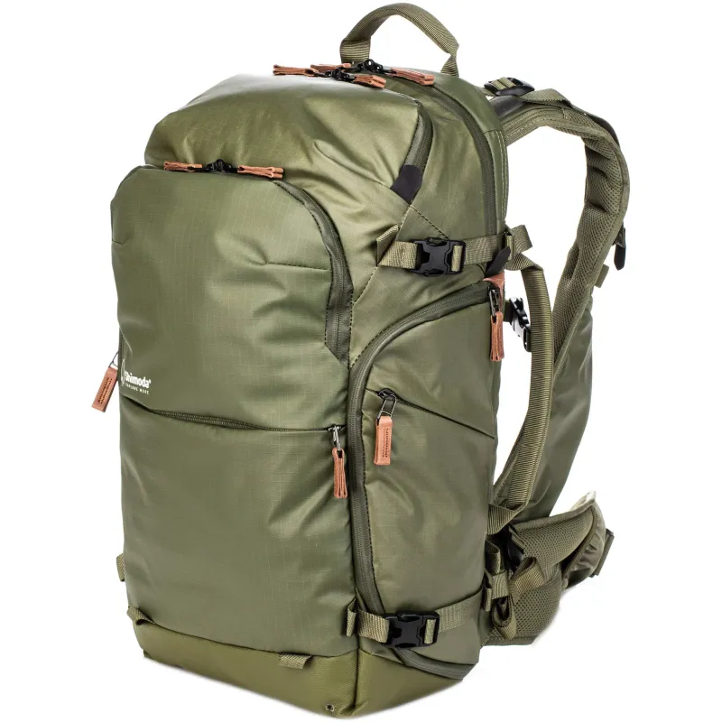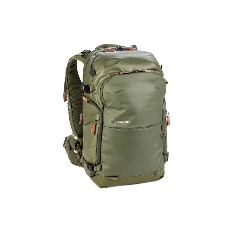 The army green Explore v2 25 Backpack Photo Starter Kit from Shimoda Designs is the smallest model in their flagship line of camera backpacks, and this kit includes their small Core Unit that is designed to hold cameras like the Fuji X-T4 and Sony a7 series but can accommodate a Canon 5D or similar-sized camera.