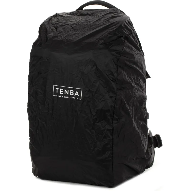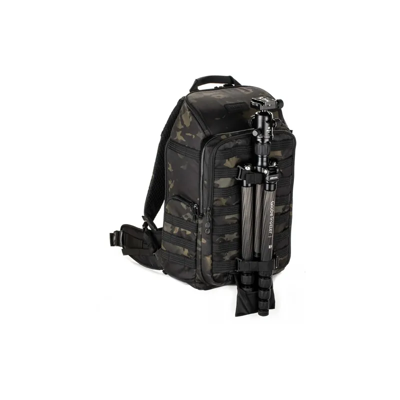 The updated multicam black, 24L Axis V2 Backpack from Tenba is built for the working professional, content creator, photographer, or filmmaker. The pack holds two mirrorless or DSLR cameras, eight 2.8mm lenses, a 16" laptop, and a compact drone. This backpack is the first to include a hidden neoprene pocket that holds an Apple AirTag or Tile Bluetooth Tracker. The MOLLE webbing all around the exterior of the pack allows you to add additional Tenba accessories, including lens capsules, battery pouches, and card wallets. Tenba's exclusive Airflow harness and auto-adjusting Pivot-Fit straps mean the pack will fit, no matter what shape or size you are. The bag has unique dual sternum straps to ensure superior load-balancing across the chest, and allowing female users to position the straps above or below the bust for superior comfort. One of the sternum straps can be removed, if desired. A reversible rain cover is included, one side is black and the other silver to reflect UV rays.
