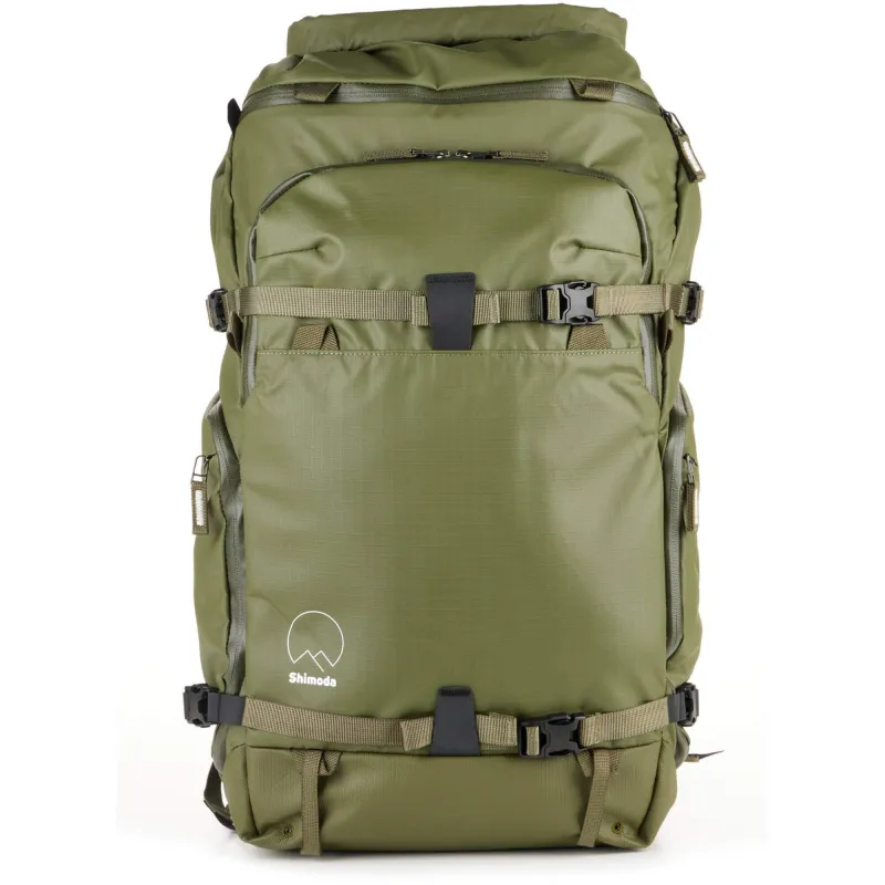 This army green Action X40 V2 Starter Kit from Shimoda Designs includes an Action X40 backpack, a medium DSLR core unit, a helmet holder, and a rain cover. The pack offers photographers a compact and durable carry solution that allows fast access to gear. The internal core unit is a divider insert that can accommodate most gripped, 6.7" DSLR cameras. Two padded sleeves hold and protect laptops or tablets up to 16". The roll top access allows you to expand or compress the volume depending on your needs. There are multiple attachment straps including TPU compression straps for increased durability when attaching bulky items such as skis. The removable helmet holder secures a bike or ski helmet to the exterior of your pack.