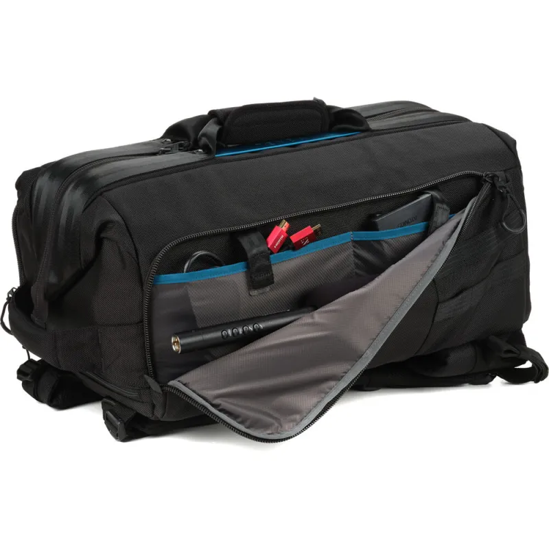 The 29L Cineluxe V2 Backpack 21 in black from Tenba accommodates compact mirrorless, DSLR, or cinema cameras up to 18.5 inches long, plus assembled accessories. It features a doctor bag-style opening down the middle for easy access to stored gear and maintaining the bag's footprint when opened. Upgrades to the V2 design include a hidden AirTag tracker pocket, MOLLE webbing on the exterior, lockable zippers, and a reversible rain cover to protect your gear from the elements.
