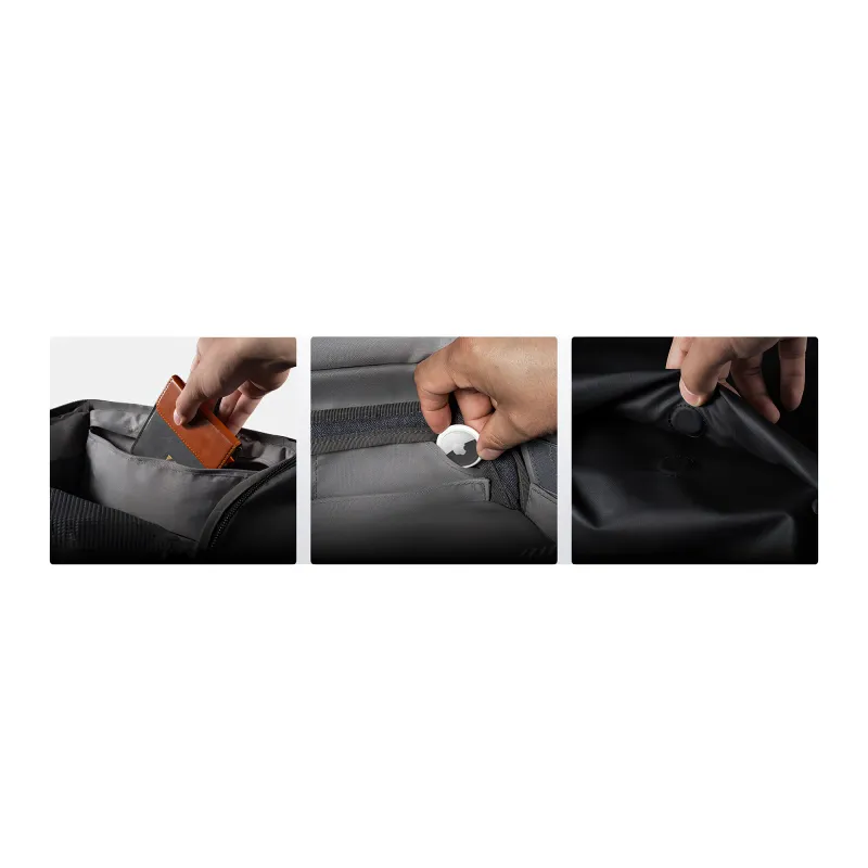 - Internal pockets for memory cards, filters, AirTags, and small items