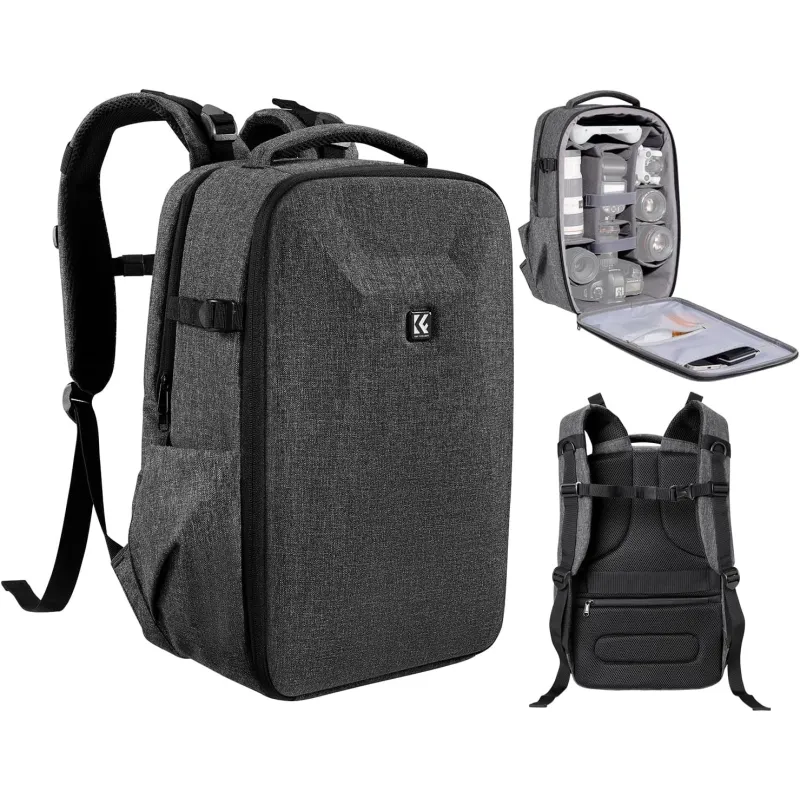 This versatile camera backpack is compatible with various DSLR, SLR, and mirrorless cameras. It features removable modular inserts for organizing cameras, flashes, and lenses. The back pocket accommodates laptops up to 15.6 inches.