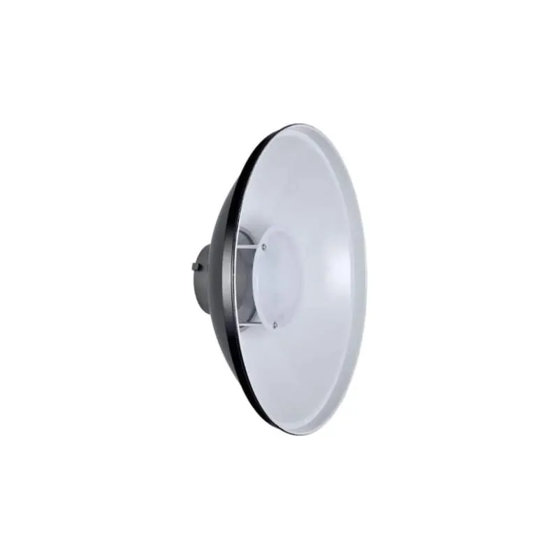 A favorite of fashion and portrait shooters, the White 42cm Beauty Dish Reflector from Godox bounces the light off a centrally positioned deflector and is directed to fill the white reflector interior.