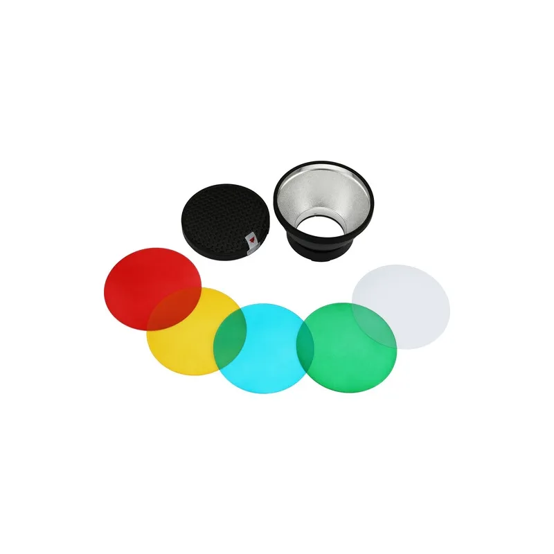Godox has provided both a control modifier and five filters to spark creativity with the Standard Reflector with Filter Holder for AD300pro Flash Head. The grid mounts easily to the reflector where it eliminates spill light while narrowing the light's beam spread for selective lighting. For creative expression, red, yellow, blue, and green filters come with the modifier. A diffusion filter is also included.
