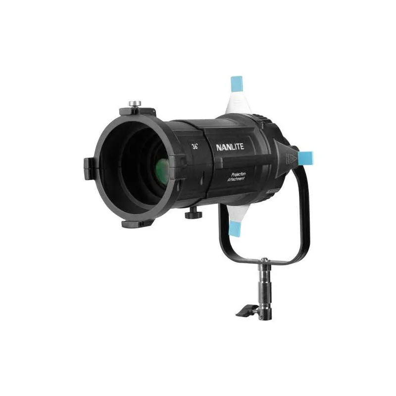 The Nanlite Projection Attachment for Bowens Mount with 36° Lens allows you to achieve complex and bold lighting effects using lights that have a Bowens mount, such as the Nanlite FS Series and larger Forza monolights. The Projection Attachment dramatically increases the output of the light you use it with. For example, the Forza 500 is over 266% brighter when this 36° version attachment is used. Included with the attachment are an array of highly creative light-shaping tools: a focusable lens, internal shutters, gel inserts, and gobos. It also supports an optional adjustable iris.