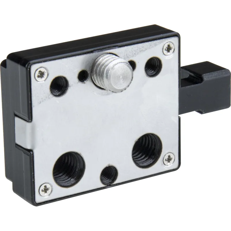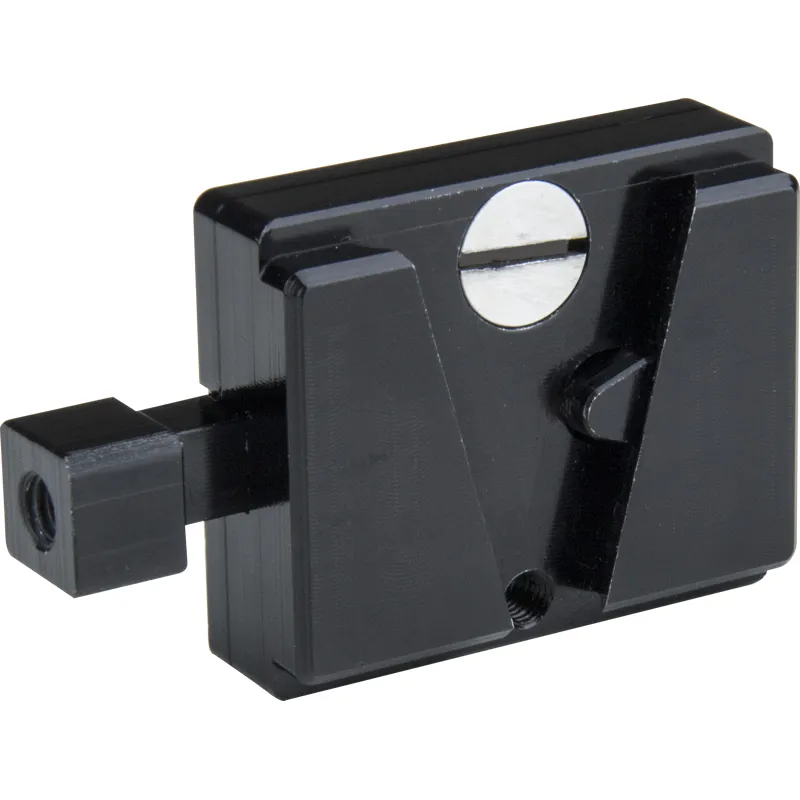 Kupo V-lock Base is precisely machined from black anodized aluminum with tight tolerances and minimized wiggles. It can be attached to the Convi clamp (KCP-700) with the supplied two M5 screws and one 3/8 to M5 adapter from the back of the V-lock base. It also features a 3/8-16 central tapped hole that can be mounted on any equipment that comes with a 3/8-16 female thread using the supplied 3/8-16 screw or through the standard 3/8-16 Arri style anti-rotation pin. The two 3/8-16 tapped holes on the back are spaced 1 inch (center to center), allowing it to be mounted on any standard cheese plate.