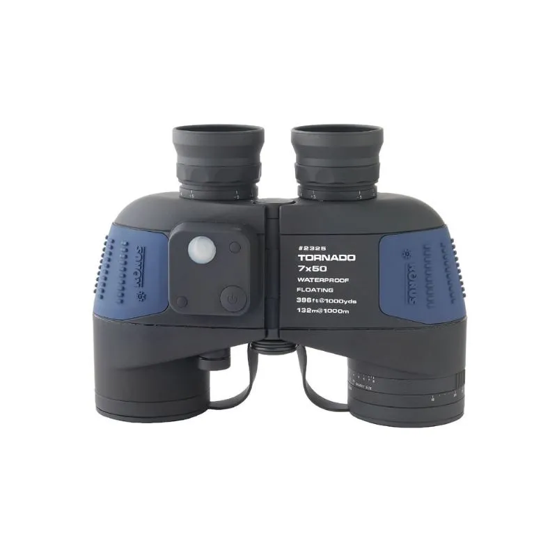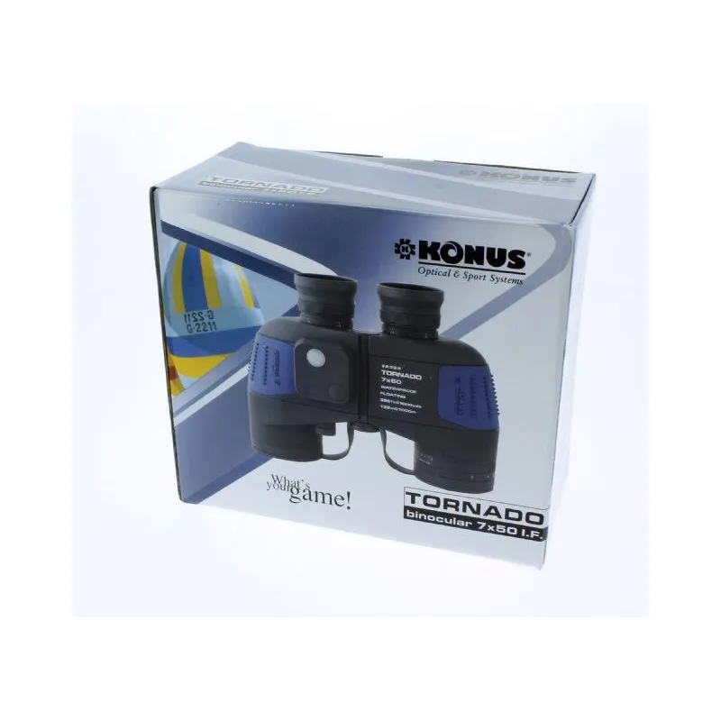 The Konus binocular Tornado 7x50 is a water sports binocular with 360 degree compass and illumination. The right ocular has a built-in scale so you can determine the distance of certain objects. The binoculars are waterproof and gas filled. The binoculars have an individual focus mechanism, so each ocular can separately be adjusted for your eyes, it is in focus from 5 meter up to infinity. Besides that it gives a calm, wide and clear image.
