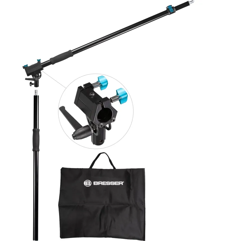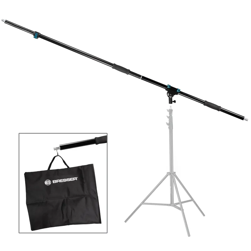 Your new right hand in the studio: The BRESSER 110-116BM 3 Section Boom A rm scores with its 3 sections and the possibilty to position lamps at right angles . Need a perfect lightning from above ? Nothing could be easier, because this boom arm masters even difficult lightning situations in the whole range of video production and photography easily. I supports you in different ways of working: Use it in the possible total length of 245 cm on a tripod with spigot connection, or hold the solidly made boom arm comfortably in your hand with the 2 padded handles and add light formers or microphones . As a boom arm stand, the unit shows its versatility.