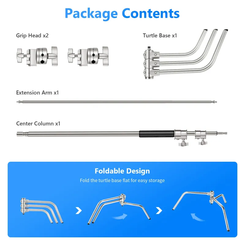 The Neewer SC320 is a professional-grade chrome-plated stainless-steel C-stand with a boom/extension arm, designed for studio and location lighting setups where maximum strength, height, and flexibility matter. With a maximum height of 10.5 ft (320 cm) and a 128 cm boom arm, this stand delivers premium performance for mounting lights, softboxes, reflectors, and more.