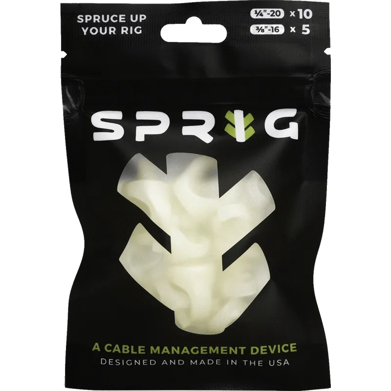 The Sprig Value Pack includes 10 original 1/4"-20 Sprig cable management clips as well as 5 of the 3/8"-16 Big Sprigs in a resealable zippered pouch.