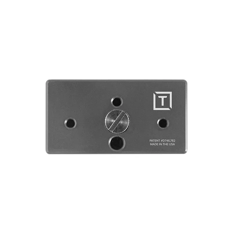This second version of the mounting plate replaces the TetherBLOCK Slim and adds a third channel for thick heavy-duty cables as well as thin and medium-sized cables. It has both a 1/4"-20 and a 3/8" tripod thread mount, allowing it to be mounted directly onto a tripod head. A 1/4"-20 slotted screw attaches the plate to the camera and can be tightened with a coin. On the bottom of the plate are two 1/4"-20 threaded holes for adding accessories like microphones or video monitors.