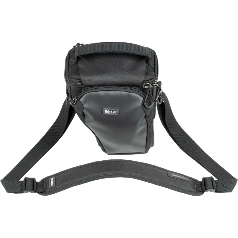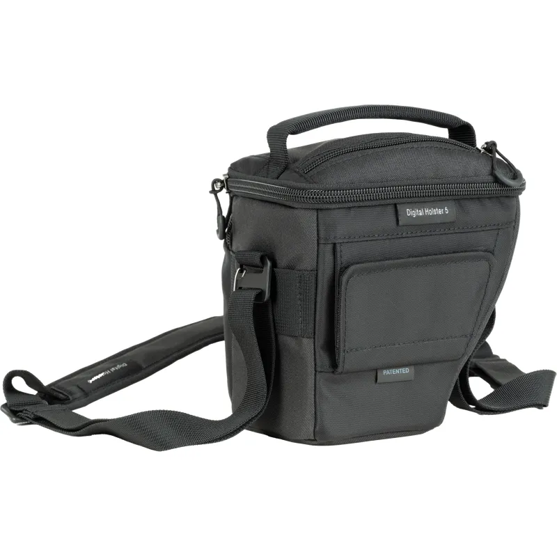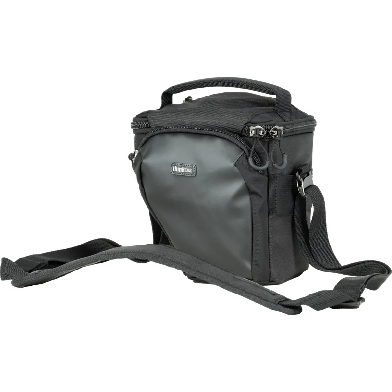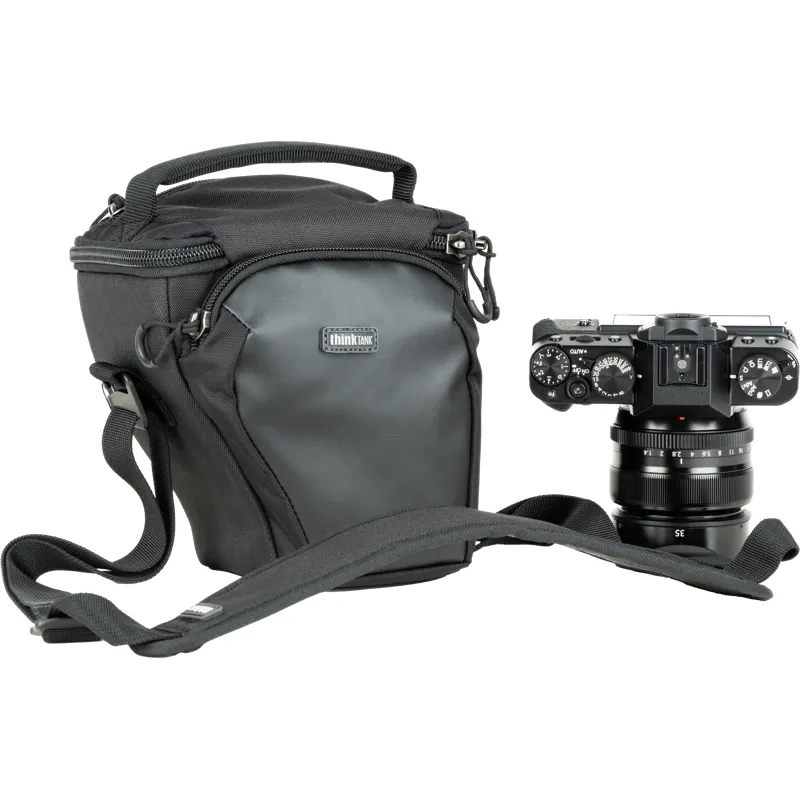 This holster is designed for compact mirrorless bodies like the Canon R50, R10, Nikon Z5, Fuji X-T30, or Sony A6000 series with a short lens attached.