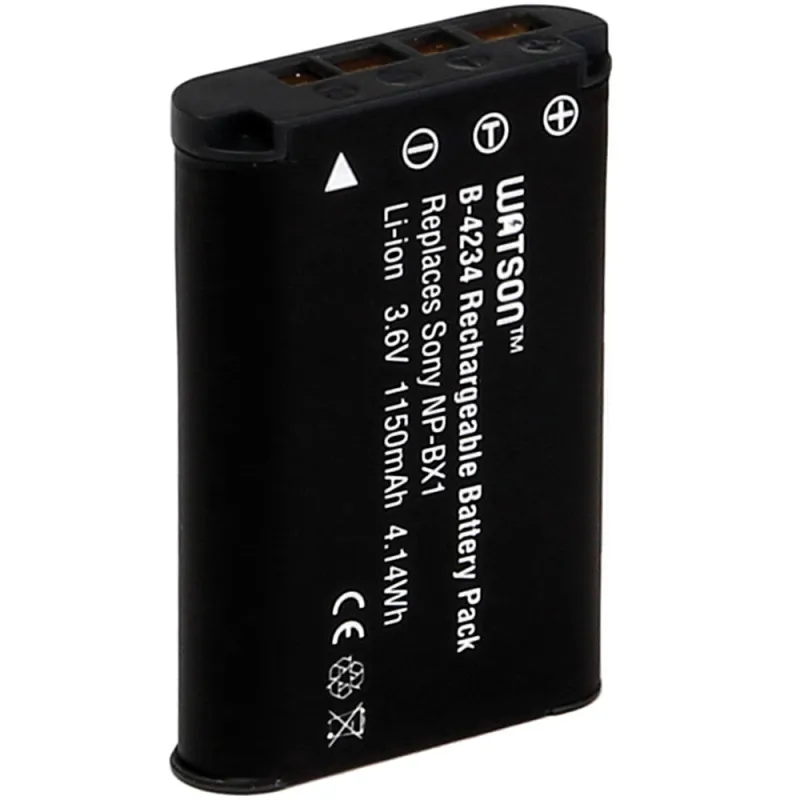 The Watson NP-BX1 Lithium-Ion Battery Pack works with the same cameras as the Sony NP-BX1. This replacement battery pack features a capacity of 1150mAh, 3.6V of output power and 4.14 watt-hours. Small and lightweight, lithium-ion batteries can be charged or discharged at any time without developing memory effect.