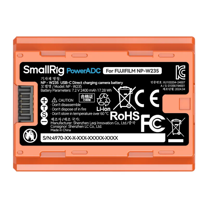 Rechargeable battery The SmallRig 4970 NP W235 USB C Rechargeable Camera Battery (Orange) can be charged via a power bank, power strip, car charger or other dedicated chargers. With high current charging (5V 2.2A) and a rated capacity of 2400mAh, you can fill up the battery in 2.5 hours and use it for a longer time.