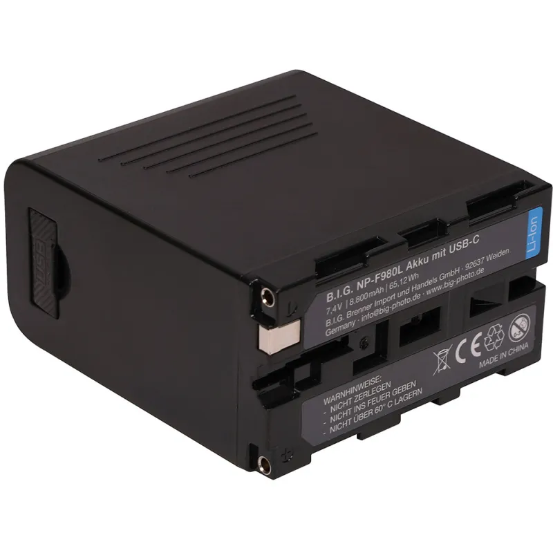 The BIG NP-F980L battery is suitable for studio and video lights, as well as many Sony cameras and camcorders that utilize Sony NP-F batteries. This battery features a USB-C port, enabling you to charge it not only with a traditional battery charger but also on the go using a power bank or USB power adapter. A USB-A to USB-C cable is included.