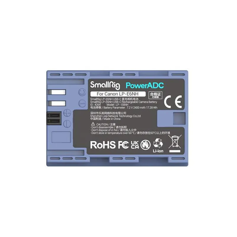 SmallRig LP-E6NH USB-C Rechargeable Camera Battery 4264 allows being charged via a power bank, power strip, car charger, or other special chargers. With high-current charging (5V 2.2A) and 2400mAh nominal capacity, you can make the battery full in 2.5 hours and run for a longer time. Fully decoded without pop-ups, this visually distinctive battery features frosted ABS and PC shell, which is fire-resistant and durable. It is exactly the same size as the original camera battery, hence no worries about it getting stuck.