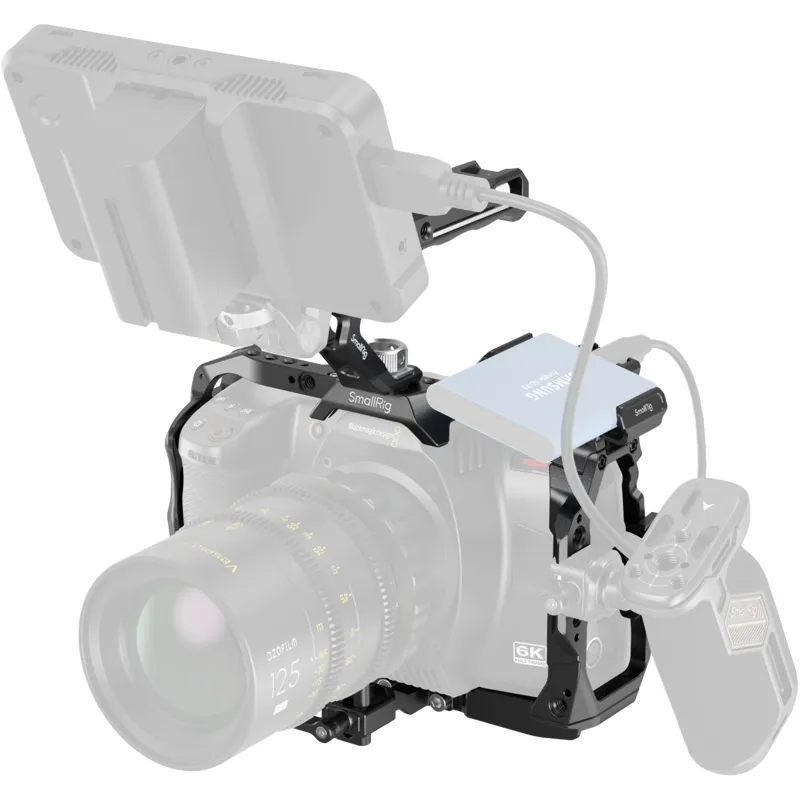Special full cage for Blackmagic Design Cinema 6K, convertible to a half cage for added versatility. Features a three point locking system Versatile built in interfaces SSD mounting bracket has a built in Cold shoe mount for quick mounting and dismounting.