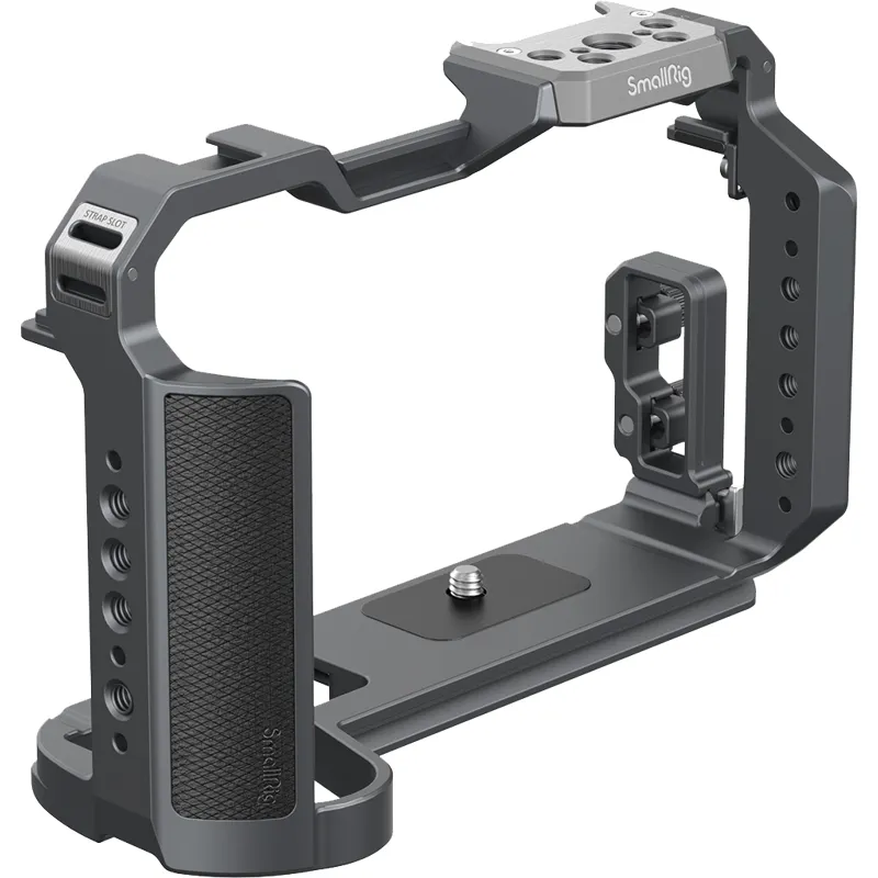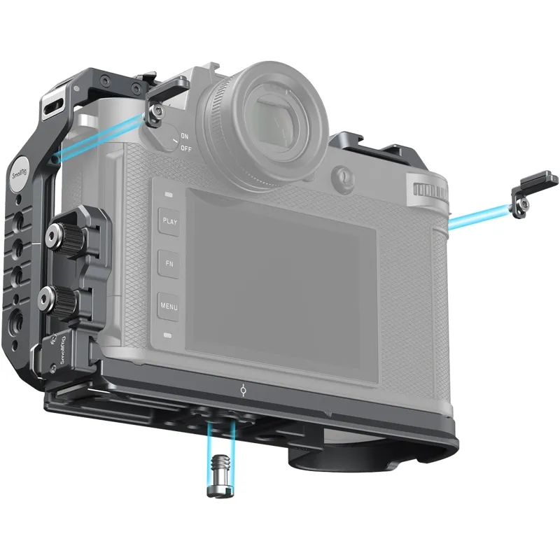 Trīs punktu fiksācijas sistēma fiksē kameru, izmantojot vienu 1/4"-20 skrūvi apakšā un divus sānu fiksācijas adapterus.