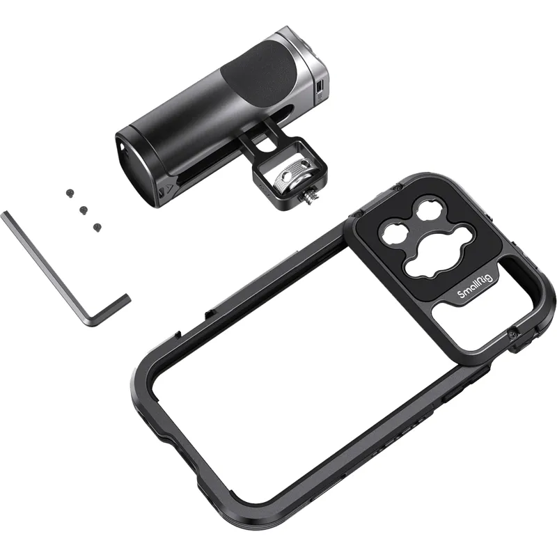 SmallRig Mobile Video Cage Kit (Single Handheld) for iPhone 14 Pro Max 4099 is a perfect mobile phone video rig for vlogging, mobile filmmaking, commercials, etc. The kit comes with a cage specially designed for iPhone 14 Pro Max and a wireless control side handle for a more stable and convenient phone shooting. The cage features 1/4"-20 anti-twist threaded holes and cold shoe mounts that support accessories as tripod, microphone, and LED light, etc. It supports M-mount or 17mm threaded lenses by replacing the backplane. It gives access to iPhone buttons, ports, radar and ultra-wide angle lens thanks to its hollow-out design. The new structure increases the bare area of the back and is fully compatible with Apple's official wireless charging devices. The metal full cage with built-in pads prevents scratches, reduces vibration. The cage enables horizontal and vertical shooting.