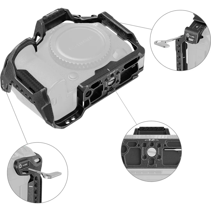 Boost your photography experience The SmallRig 4975 Black Mamba Cage for Canon EOS R5 Mark II has been carefully crafted to provide comprehensive protection and a multitude of expansion interfaces for your camera. The cage features a secure locking mechanism with a 1/4 20 screw at the bottom and two side blocks, along with integrated silicone pads to prevent scratches on your camera. Retaining the iconic Black Mamba style, this cage offers full access to all camera buttons and interfaces.