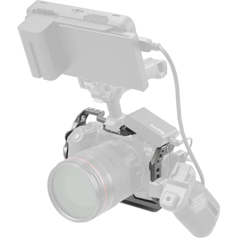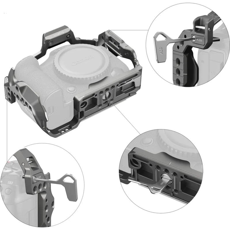 Boost your photography experience The SmallRig 4977 HawkLock Quick Release Cage for Canon EOS R5 Mark II has been carefully crafted to provide comprehensive protection and a wide range of expansion interfaces for your camera. The cage secures the camera in place with a single 1/4 20 screw at the base and two positioning blocks at the sides, with built in silicone pads to prevent scratching the camera.