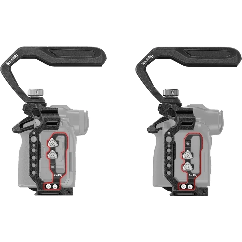 SmallRig “Black Mamba” Kit for EOS R5 & R6 3234 includes an ARRI top handle, a full cage and a dedicated cable clamp. The all-in-one cage provides protection and multiple accessory mounts for the camera. Its new design possesses clear outlines around the grip, maintaining full access to the camera's controls. The attached cable clamp locks the HDMI cable to prevent accidental disconnection and ensure stable signal; the lightweight ARRI top handle weighs only 122g and has an ergonomic design for a comfortable grip and a firm hold. Both the cage and the handle feature multiple 1/4"-20 & 3/8"-16 threaded holes to support accessories like magic arm and side handle. The kit weighs just 313g for the user to reduce arm load in shooting.
