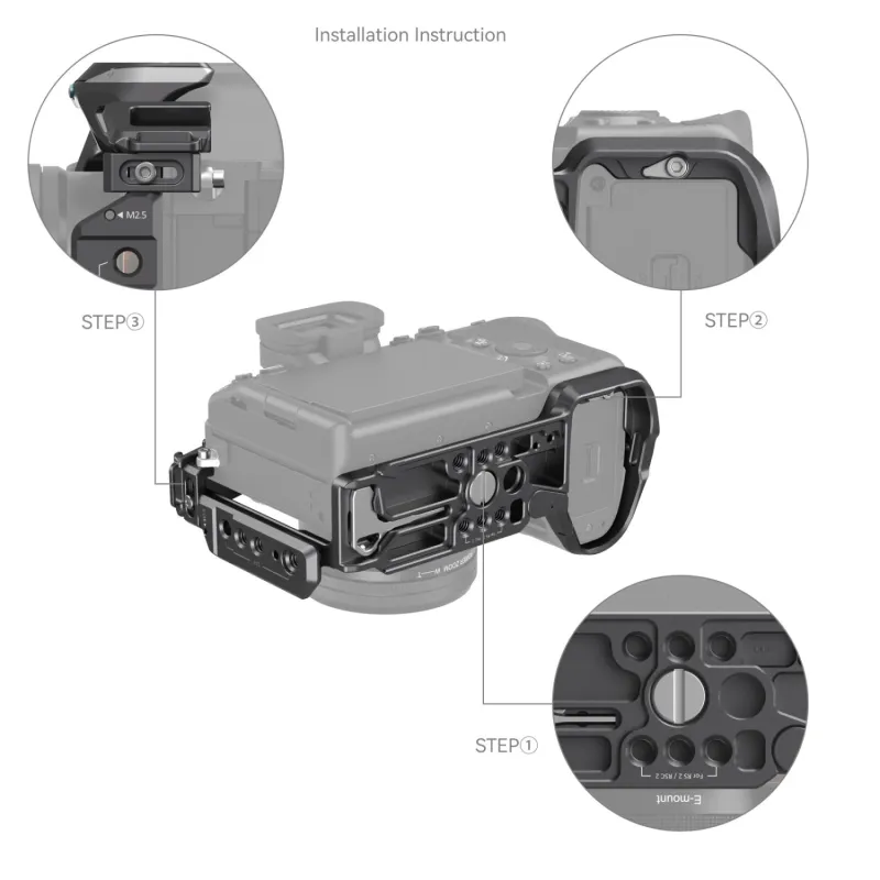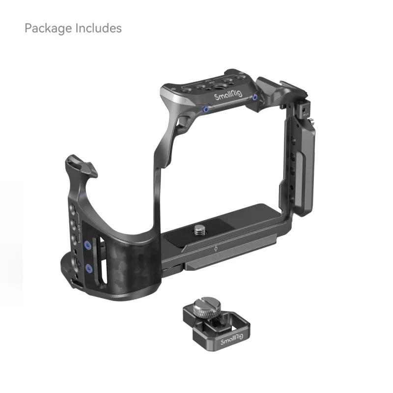 SmallRig "Rhinoceros" Cage Kit for Sony Alpha 7R V / Alpha 7 IV / Alpha 7S III 4308 is designed to attach accessories and protect the camera and HDMI port. The cage secures the camera firmly via a locating pin, a 1/4"-20 screw, and an M2.5 screw together. It features a clean streamlined design that gives full access to the top buttons. The HDMI cable clamp is tightened via a flat-head screw, protecting the interfaces to ensure stable signal transmission.