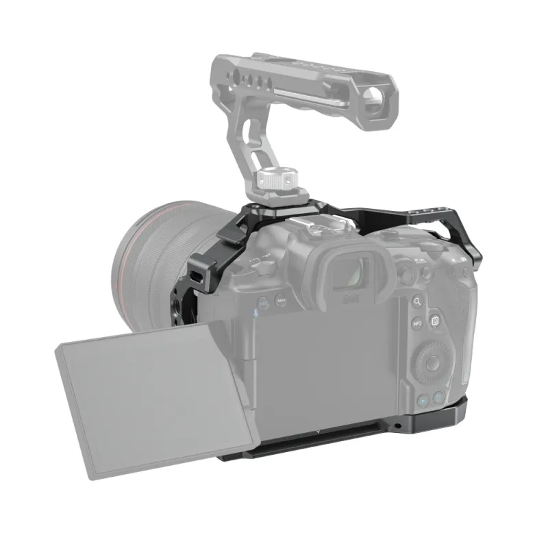 SmallRig Camera Cage for Canon EOS R5, R5C and R6 2982B maintains access to the camera's controls and features a variety of mounting options. In addition to the built-in NATO rail on the top, one cold shoe mount and multiple 1/4"-20 and 3/8"-16 threaded holes, this formfitting aluminum cage features several ARRI-style mounts for preventing accessories from twisting when mounted on the cage. The cage also incorporates two anti-twist pins on the base plate in addition to the 1/4"-20 camera mounting screw so your camera can't move around in the cage. You can attach SmallRig Top Handle 1984 or HTN2439, SmallRig Wooden Side Handle 2093 for hand-held shooting, and SmallRig Cable Clamp 2981 to protect the HDMI and USB-C cables. ARRI-style mounts on the top and side are provided to attach SmallRig ARRI Locating Handle 2165 or SmallRig Ball Head Magic Arm 2115. Strap holes are included to add a separately available hand strap PAC2456, PSW2398 or neck strap PSC2428 to your rig. Besides, a screwdriver is built into the bottom of the cage for tightening the camera screw.