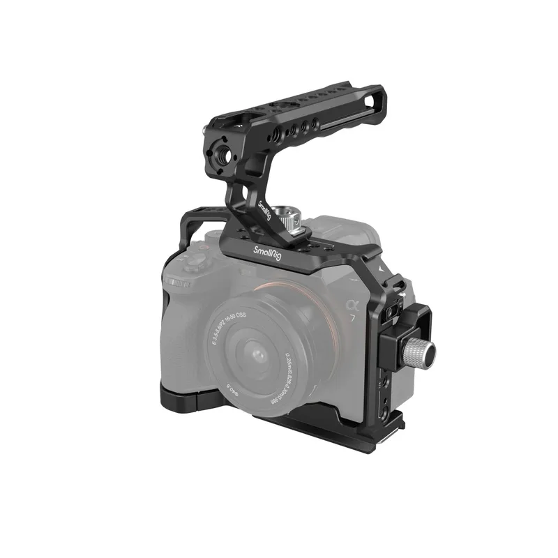SmallRig Basic Kit for Sony Alpha 7 IV/Alpha 7 S III 3668 is designed to facilitate low-angle shots and protect the camera while offering a wide range of accessory mounts. It includes a cage, an HDMI cable clamp, and a top handle. The top handle feels comfortable and enables easy carrying and at a low-angle shot. 1/4"-20 threaded holes, ARRI 3/8" -16 locating holes, cold shoes and NATO rails support monitor mount 2294, microphones, LED lights, monitor mount 2903, NATO accessories. The HDMI cable clamp, mounted onto the left side of the cage via one 1/4"-20 screw and two locating pins, prevents deflection and fixes cables with a thumbscrew to protect interfaces and ensure stability signal transmission. In addition, holes on both sides of the cage allow attaching hand straps. The cage comes with a built-in magnetic flat-head screwdriver & hex spanner for easy disassembly and assembly.